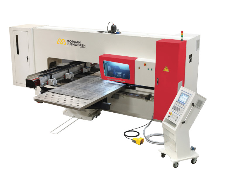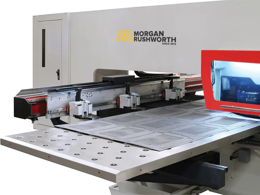 At Morgan Rushworth, turret punch presses are supplied as production machines rather than entry equipment. Rigid frames, precision indexing systems and modern CNC control platforms allow consistent accuracy at high stroke rates, making them suited to both batch manufacturing and repeat production. Components can be produced complete with countersinks, louvres, extrusions and forming features; often ready for bending straight off the machine.